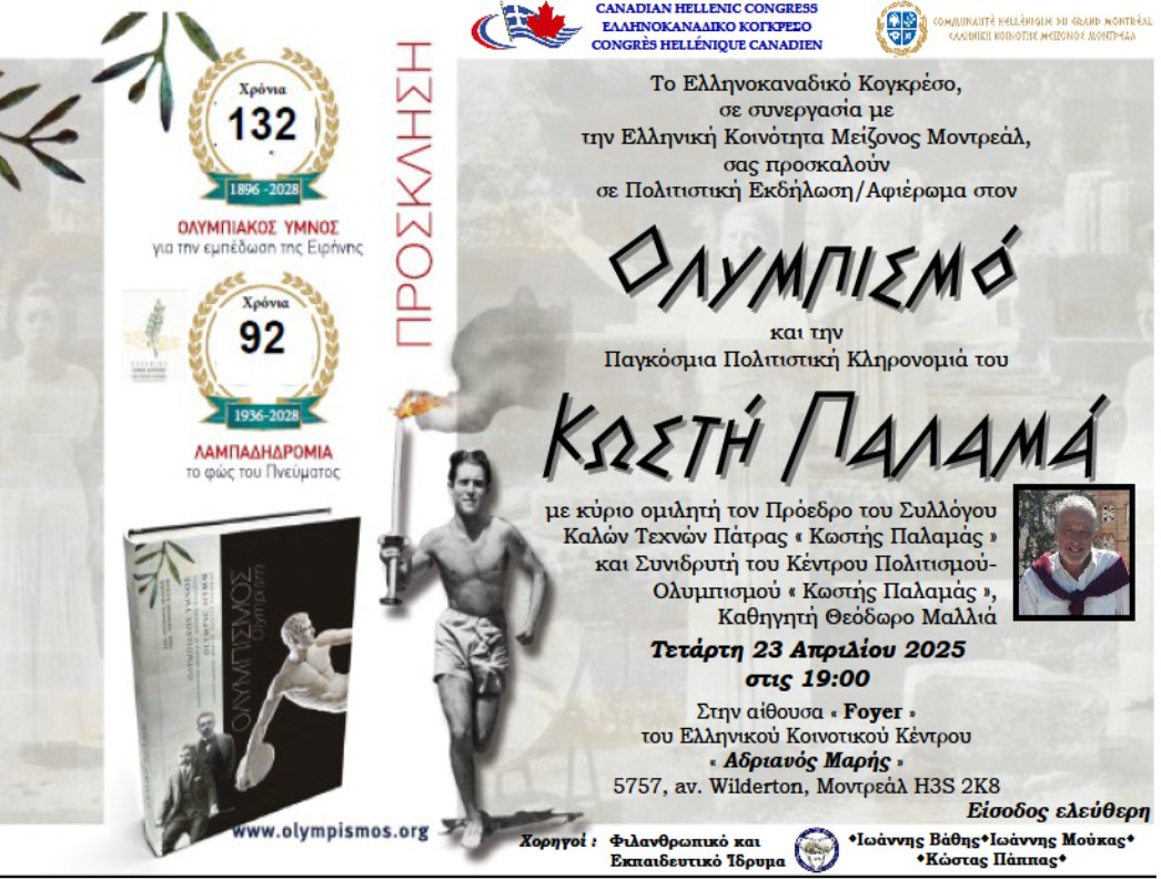 The Hellenic Congress of Canada and the Hellenic Community of Greater Montreal support and highlight the Olympic ideals and the cultivation of excellence promoted globally by the Patras Fine Arts Association “Kostis Palamas” and the Center for Culture and Olympism, with guest speaker Professor Theodoros Mallias. It was a particularly moving event for the Hellenic
