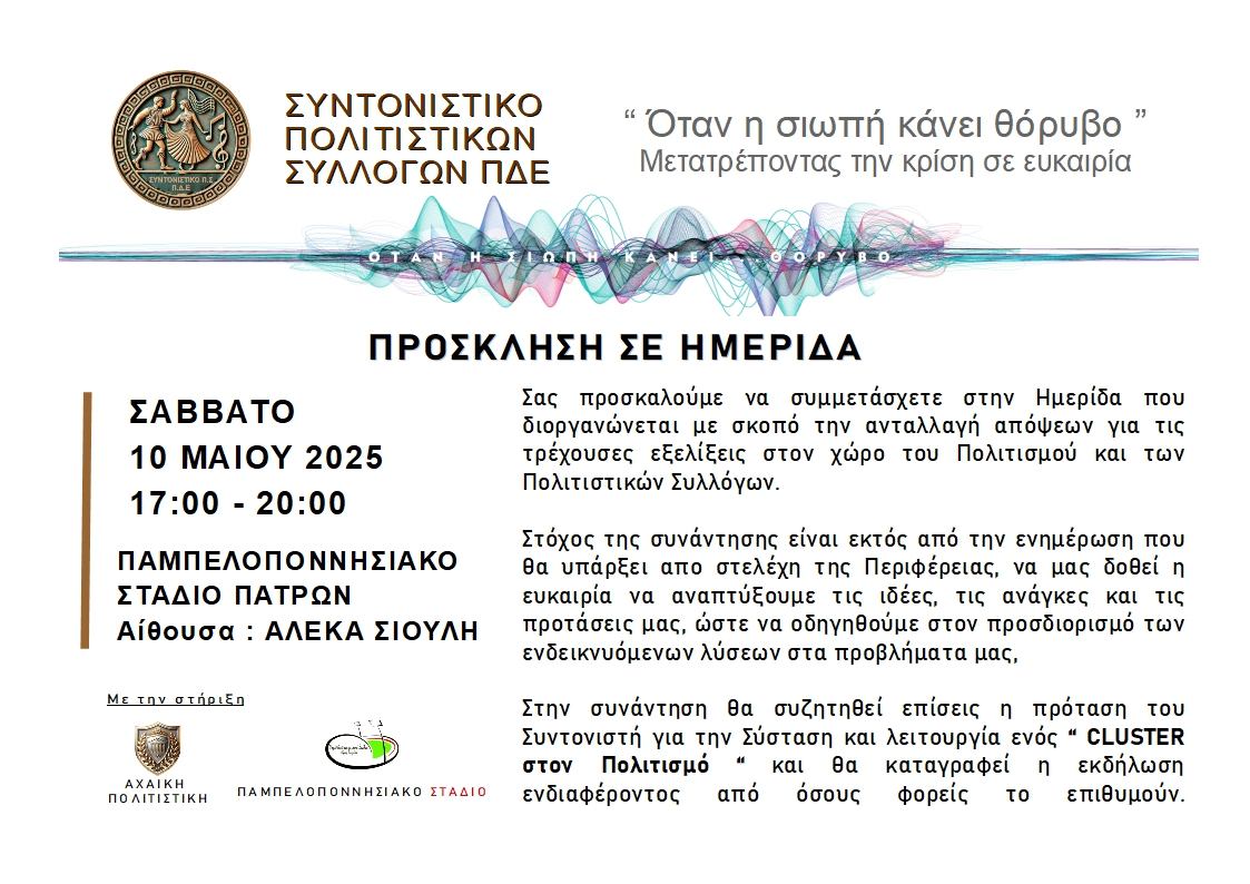 AT THE CONFERENCE ON CULTUREA CRY OF CONCERN FROM EXPATRIATES FOR THE CULTIVATION OF CULTURE AND LANGUAGE IN THEIR CHILDREN With a strong cultural interest, the conference organized by the Coordinating Committee of Cultural Associations of the Region of Western Greece was held on Saturday, May 10th, at the Pampeloponnesian Stadium of Patras, in the