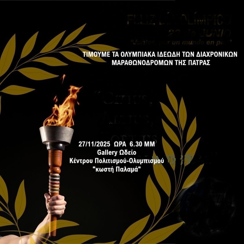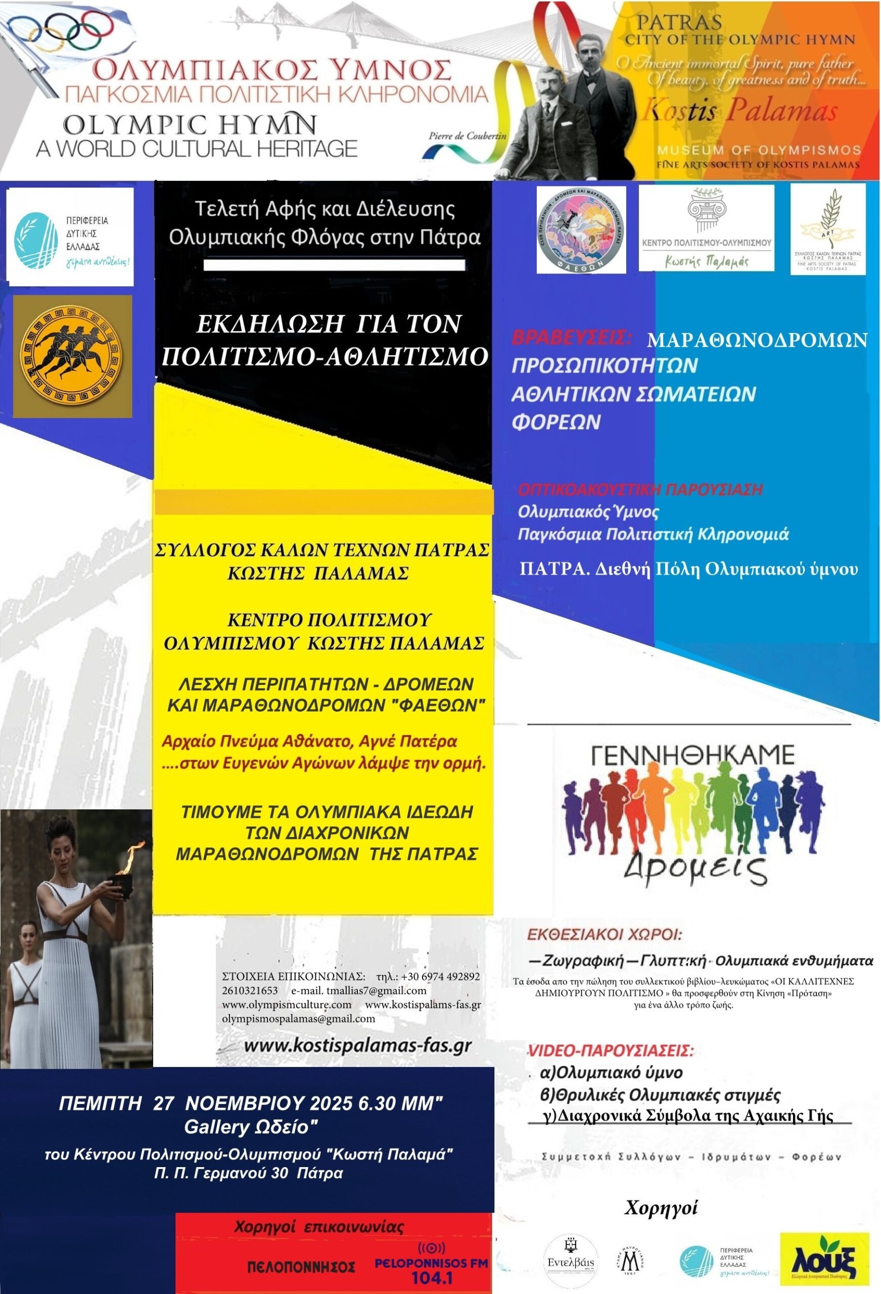 “ΓΕΝΝΗΘΗΚΑΜΕ ΔΡΟΜΕΙΣ” Ο ΣΥΛΛΟΓΟΣ ΚΑΛΩΝ ΤΕΧΝΩΝ ΠΑΤΡΑΣ «ΚΩΣΤΗΣ ΠΑΛΑΜΑΣ» ΤΟ ΚΕΝΤΡΟ ΠΟΛΙΤΙΣΜΟΥ-ΟΛΥΜΠΙΣΜΟΥ ΚΑΙ Η ΛΕΣΧΗ ΠΕΡΙΠΑΤΗΤΩΝ ΔΡΟΜΕΩΝ ΚΑΙ ΜΑΡΑΘΩΝΟΔΡΟΜΩΝ «ΦΑΕΘΩΝ» Στα πλαίσια των εκδηλώσεων της Αφής της Ολυμπιακής Φλόγας στην Πάτρα, και ενόψει των Χειμερινών Ολυμπιακών Αγώνων «Μιλάνο 2026», τιμούμε τα Ολυμπιακά ιδεώδη των διαχρονικών Μαραθωνοδρόμων της Πάτρας, στην καλαίσθητη αίθουσα Gallery Ωδείο του Κέντρου