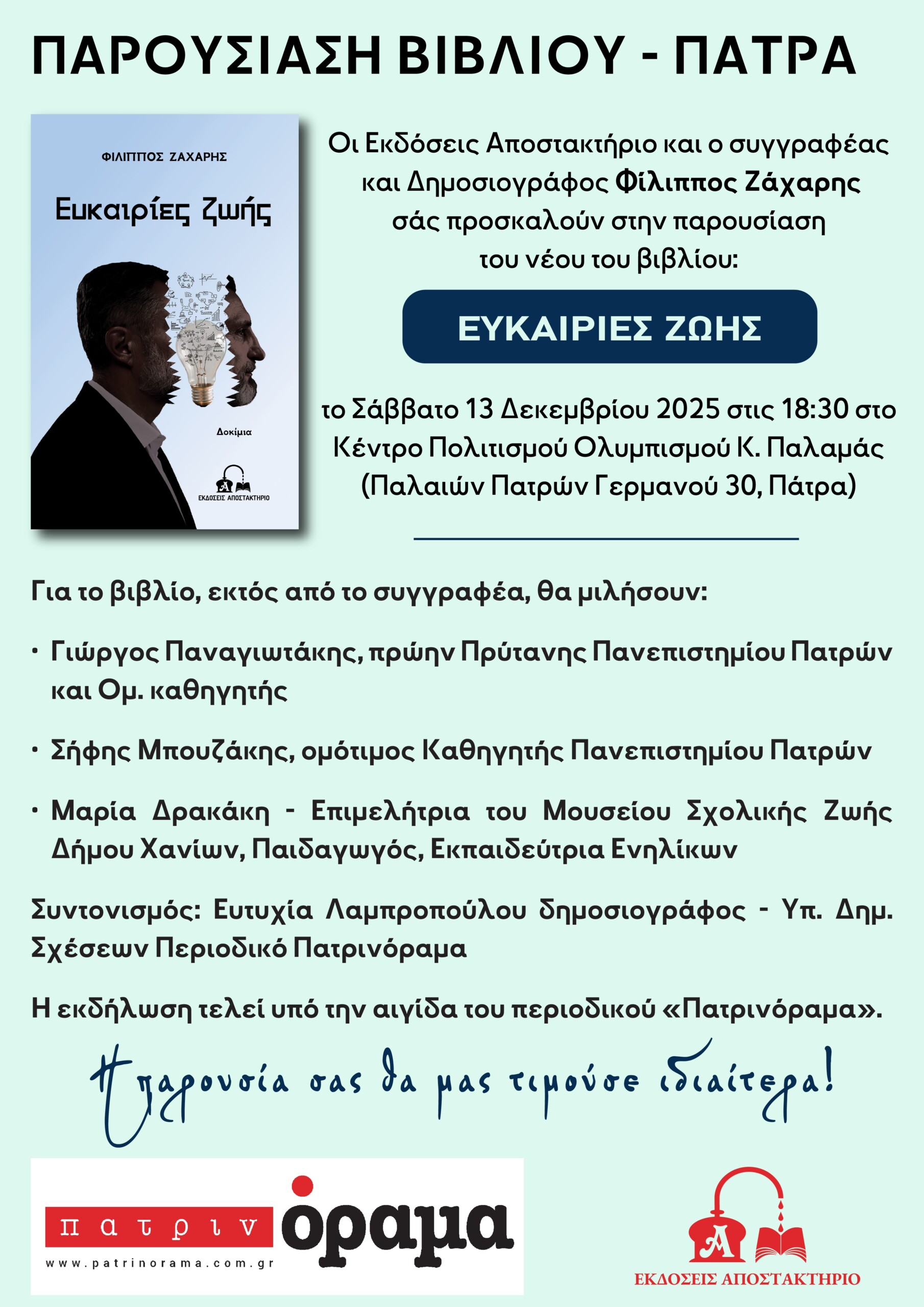 ΠΑΡΟΥΣΙΑΣΗ ΒΙΒΛΙΟΥ “ΕΥΚΑΙΡΙΕΣ ΖΩΗΣ” του συγγραφέα και δημοσιογράφου Φίλιππου Ζάχαρη στο Κέντρο Πολιτισμού-Ολυμπισμού “Κωστής Παλαμάς” (Π.Π. Γερμανού 30, Πάτρα, έναντι Ρωμαϊκού Ωδείου) στις 13/12/25 ημέρα Σάββατο και ώρα 18:30.
