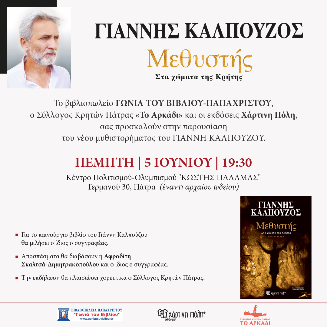 Η «GALLERY ΩΔΕΙΟ» ΤΟΥ ΚΕΝΤΡΟΥ ΠΟΛΙΤΙΣΜΟΥ-ΟΛΥΜΠΙΣΜΟΥ «ΚΩΣΤΗΣ ΠΑΛΑΜΑΣ» ΦΙΛΟΞΕΝΗΣΕ ΤΗΝ ΠΑΡΟΥΣΙΑΣΗ ΤΟΥ ΒΙΒΛΙΟΥ «ΤΟΥ ΚΑΤΑΞΙΩΜΕΝΟΥ ΣΥΓΓΡΑΦΕΑ ΙΩΑΝΝΗ ΚΑΛΠΟΥΖΟ ΜΕ ΤΙΤΛΟ «ΜΕΘΥΣΤΗΣ ΣΤΑ ΧΩΜΑΤΑ ΤΗΣ ΚΡΗΤΗΣ» ΤΙΜΗΤΙΚΗ ΑΠΟΝΟΜΗ ΤΟΥ ΒΙΒΛΙΟΥ-ΛΕΥΚΩΜΑΤΟΣ ΤΟΥ ΣΥΛΛΟΓΟΥ ΚΑΛΩΝ ΤΕΧΝΩΝ ΠΑΤΡΑΣ ΚΩΣΤΗΣ ΠΑΛΑΜΑΣ «ΟΙ ΚΑΛΛΙΤΕΧΝΕΣ ΔΗΜΙΟΥΡΓΟΥΝ ΠΟΛΙΤΙΣΜΟ» ΤΟΥ ΣΥΓΓΡΑΦΕΑ ΜΑΛΛΙΑ ΘΕΟΔΩΡΟΥ ΣΤΟΝ ΓΝΩΣΤΟ ΣΥΓΓΡΑΦΕΑ Προχθές, 5/6, στην αισθητική αίθουσα «Gallery Ωδείο» του