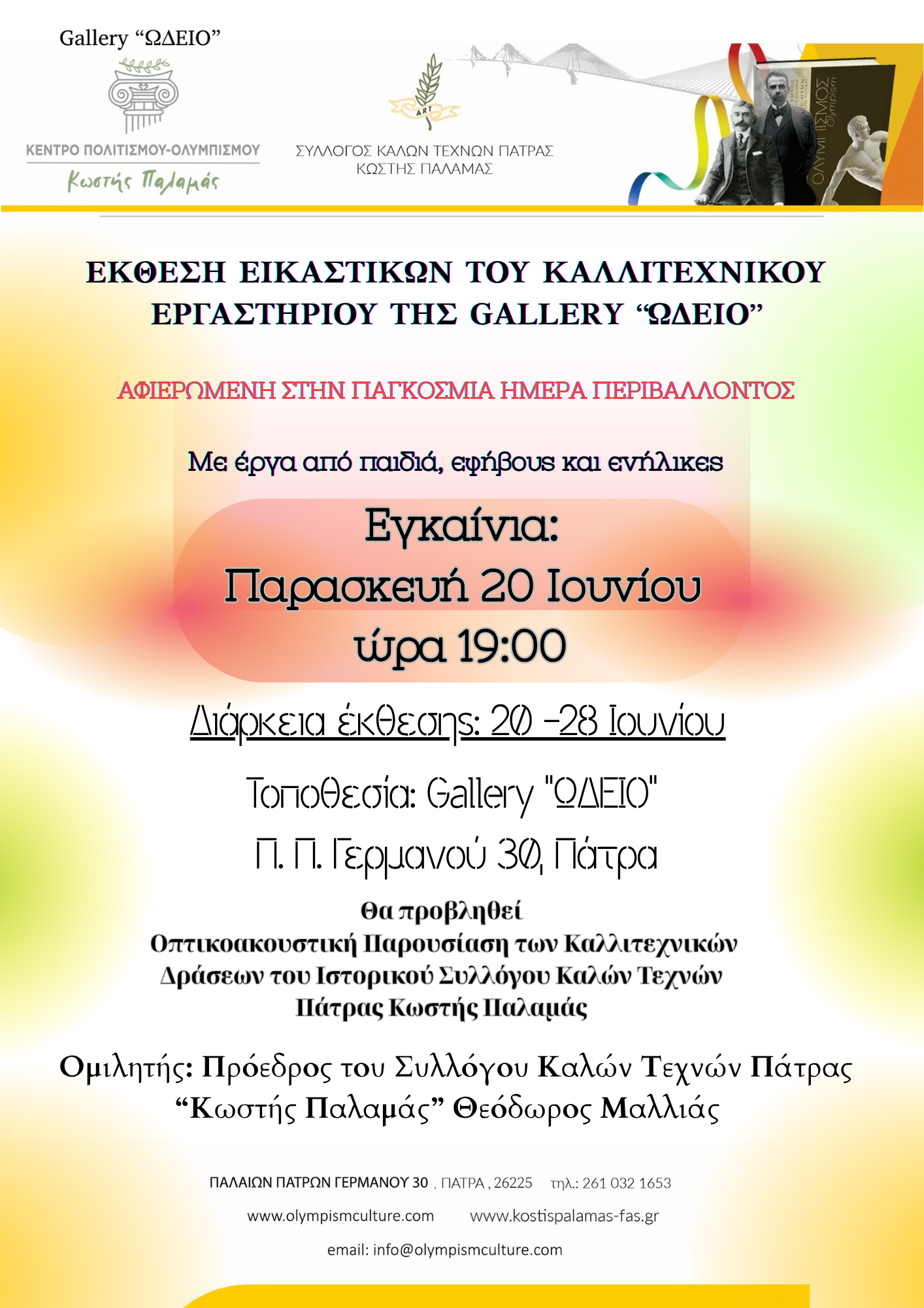 ΕΚΘΕΣΗ ΕΙΚΑΣΤΙΚΩΝ ΜΙΚΡΩΝ ΚΑΙ ΜΕΓΑΛΩΝ ΤΟΥ ΚΑΛΛΙΤΕΧΝΙΚΟΥ ΕΡΓΑΣΤΗΡΙΟΥ ΤΗΣ «GALLERY ΩΔΕΙΟ» ΤΟΥ ΚΕΝΤΡΟΥ ΠΟΛΙΤΙΣΜΟΥ-ΟΛΥΜΠΙΣΜΟΥ ΚΑΙ ΣΥΛΛΟΓΟΥ ΚΑΛΩΝ ΤΕΧΝΩΝ ΠΑΤΡΑΣ «ΚΩΣΤΗΣ ΠΑΛΑΜΑΣ» ΑΦΙΕΡΩΜΕΝΗ ΣΤΗΝ ΠΑΓΚΟΣΜΙΑ ΗΜΕΡΑ ΠΕΡΙΒΑΛΛΟΝΤΟΣ Με ιδιαίτερη χαρά, εγκαινιάζουμε την Παρασκευή 20/6/2025 και ώρα 19.00 μμ, στην γνωστή αξιοπρεπή αίθουσα Τέχνης Gallery Ωδείο» Γερμανού 30, του Κέντρου Πολιτισμού-Ολυμπισμού Κωστής Παλαμάς» την ετήσια ολοκλήρωση των