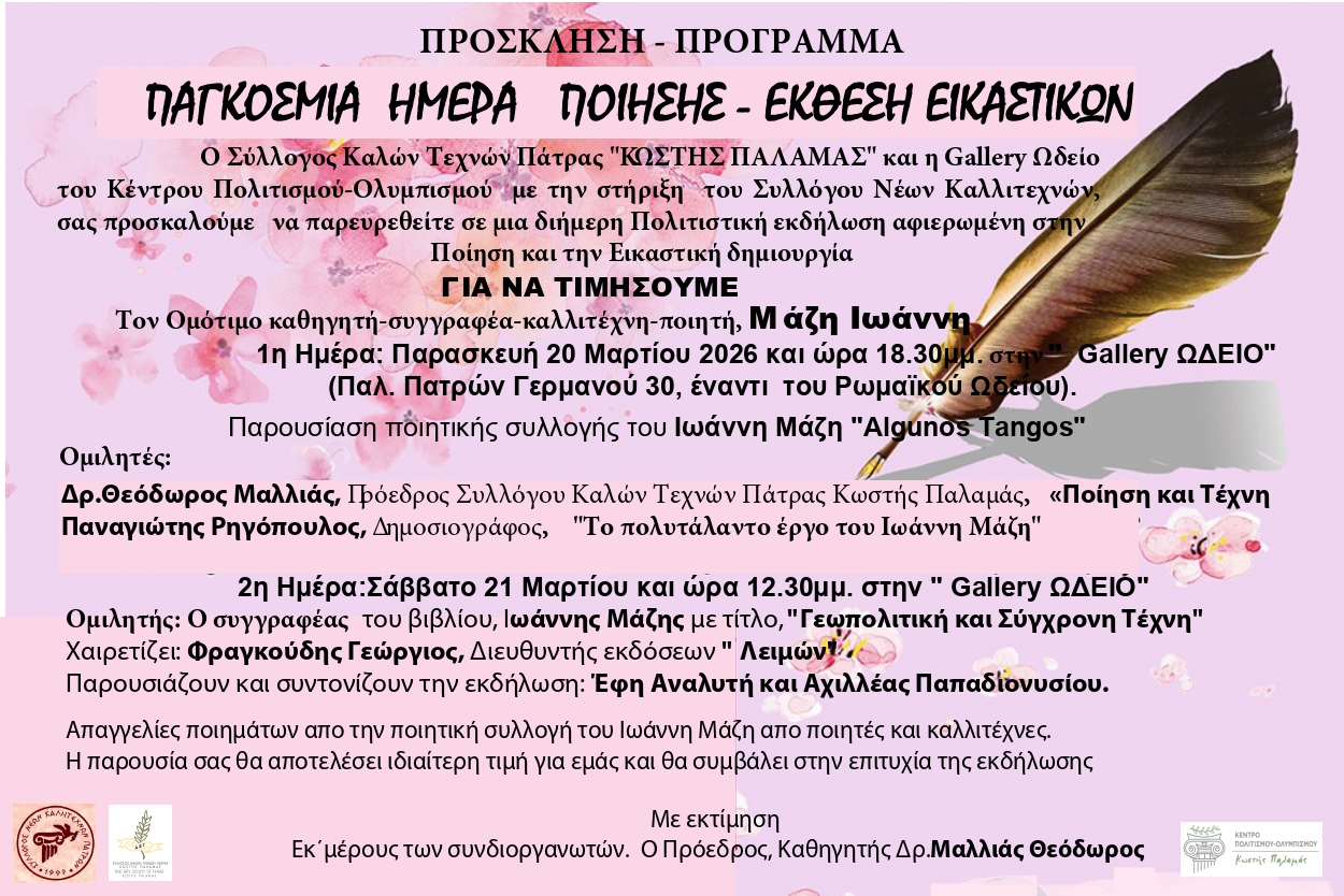 ΣΤΑ ΠΛΑΙΣΙΑ ΤΗΣ ΕΤΗΣΙΑΣ ΕΚΘΕΣΗΣ ΕΙΚΑΣΤΩΝ ΤΟΥ ΣΥΛΛΟΓΟΥ ΚΑΛΩΝ ΤΕΧΝΩΝ ΠΑΤΡΑΣ «ΚΩΣΤΗΣ ΠΑΛΑΜΑ» ΚΑΙ ΤΟΝ ΕΟΡΤΑΣΜΟ ΤΗΣ ΠΑΓΚΟΣΜΙΑΣ ΗΜΕΡΑΣ ΠΟΙΗΣΗΣ ΤΙΜΟΥΜΕ ΤΟΝ ΟΜΟΤΙΜΟ ΚΑΘΗΓΗΤΗ – ΕΠΙΣΤΗΜΟΝΑ-ΚΑΛΛΙΤΕΧΝΗ-ΣΥΓΓΡΑΦΕΑ ΚΑΙ ΠΟΙΗΤΗ-ΓΙΑΝΝΗ ΜΑΖΗ ΣΤΗΝ ΚΑΛΑΙΣΘΗΤΗ GALLERY ΩΔΕΙΟ ΠΡΟΣΦΟΡΑ ΤΟΥ ΚΕΝΤΡΟΥ ΠΟΛΙΤΙΣΜΟΥ-ΟΛΥΜΠΙΣΜΟΥ “ΚΩΣΤΗ ΠΑΛΑΜΑ”