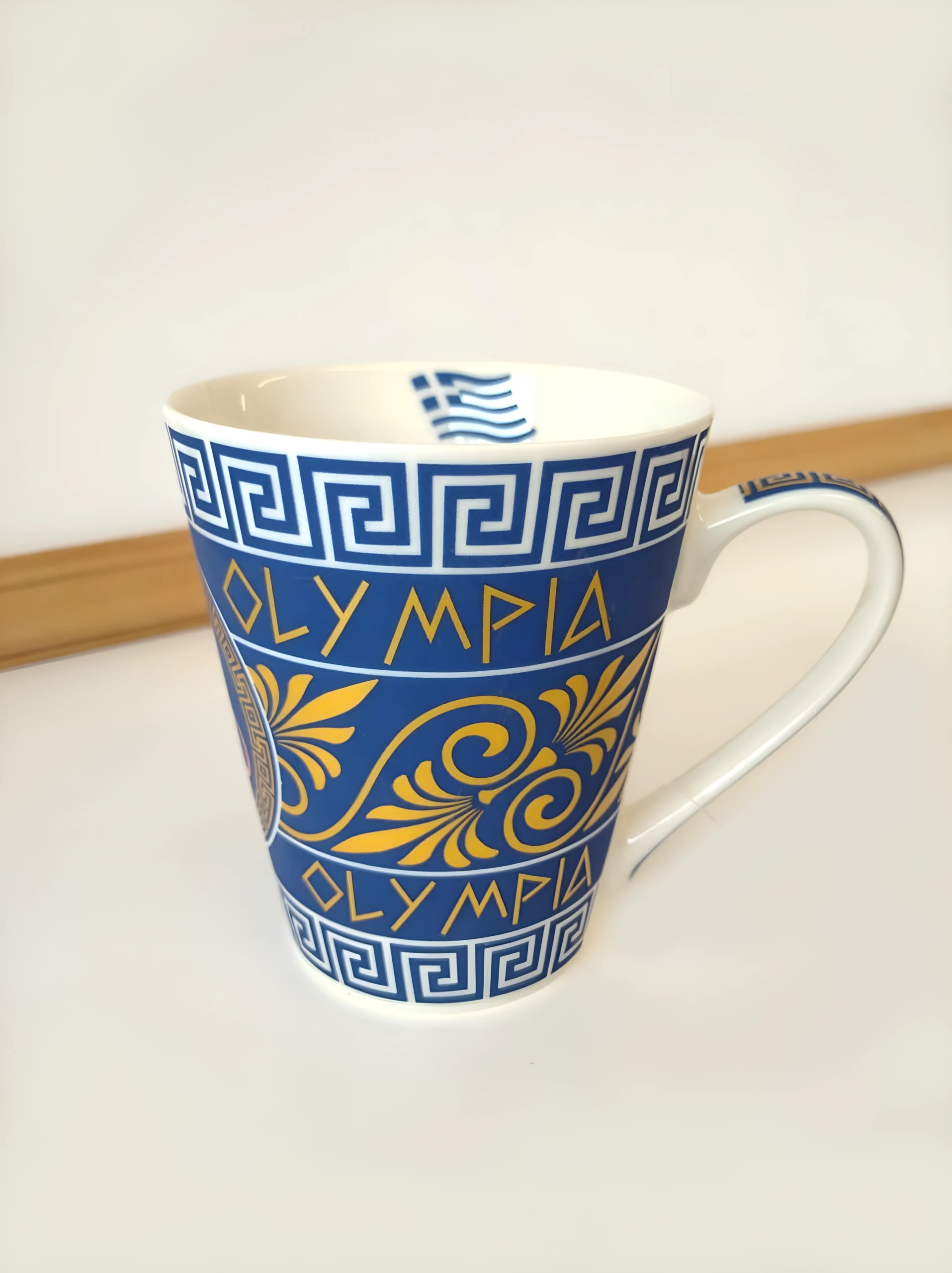 Μεγάλης χωρητικότητας κούπα από φίνα πορσελάνη που μπορεί να χρησιμοποιηθεί για να σερβίρετε ζεστά ροφήματα όπως καφέ, τσάι, κακάο κλπ. Μπορεί να αποτελέσει ένα όμορφο στοιχείο για το σπίτι, το γραφείο ή ακόμα και ως δώρο. Είναι διαθέσιμη σε μπλε και χρυσά ματ σχέδια με κεντρικό την Ολυμπιακή Φλόγα και τους Ολυμπιακούς Κύκλους.
