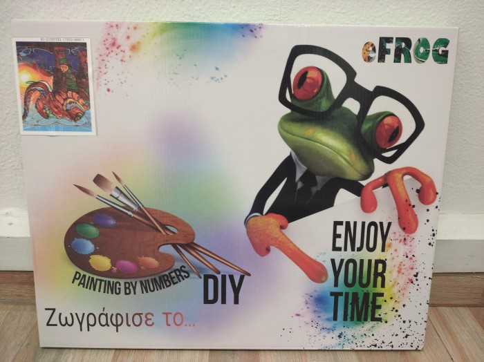 Στη συσκευασία περιλαμβάνονται: Καμβάς με αριθμημένες περιοχές, αριθμημένα χρώματα, πινέλα, ένα δείγμα του πίνακα σε Α3 χαρτί αχρωμάτιστο και ένα μικρό χρωματισμένο δείγμα του πίνακα